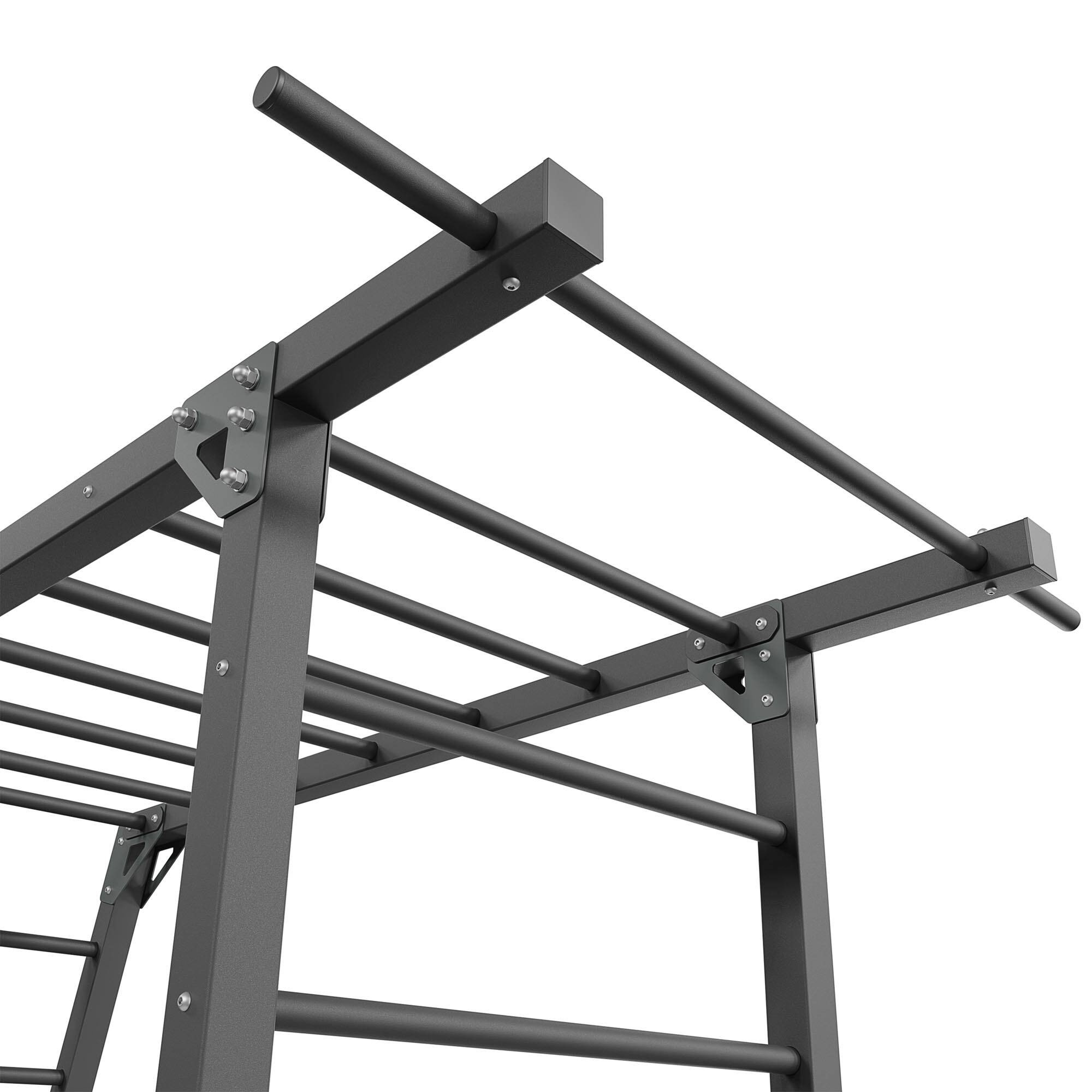 De plus, l'un des échelons de la partie horizontale a été prolongé au-delà du contour de l'échelle, ce qui crée une barre pour les tractions serrées et larges.